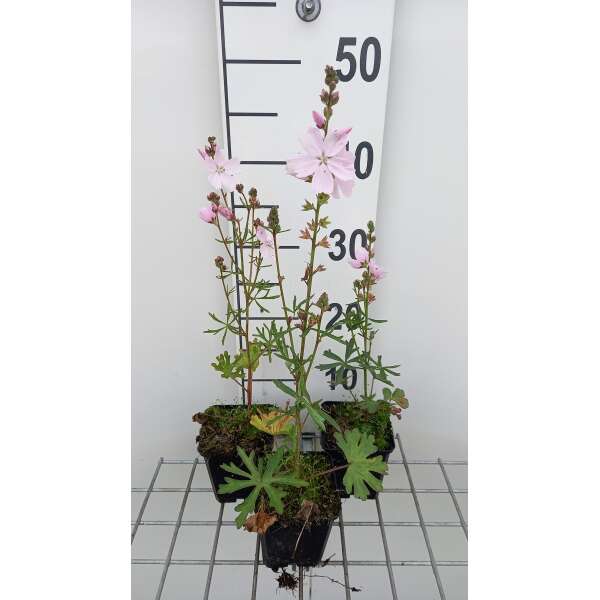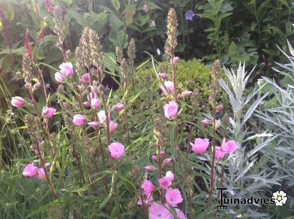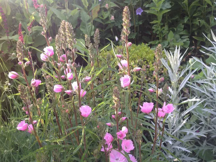 Sidalcea 'Elsie Heugh' a une croissance dressée et des feuilles profondément lobulées et vertes.
