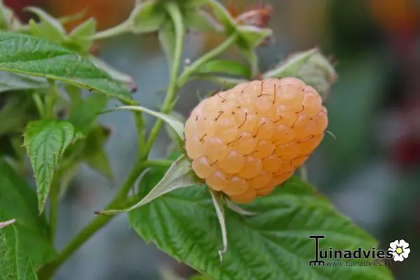 Rubus idaeus 'Autumn Amber' est une framboise d’automne sans épines de couleur jaune abricot.Une variété avec un bon rendement de fruits très aromatiques.Prêt à choisir en août.