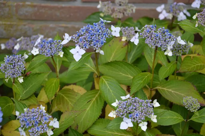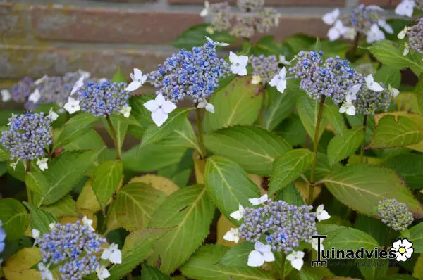Lacecap (Teller) fleurit avec de petites fleurs fertiles, bleues ou bleu-violet.