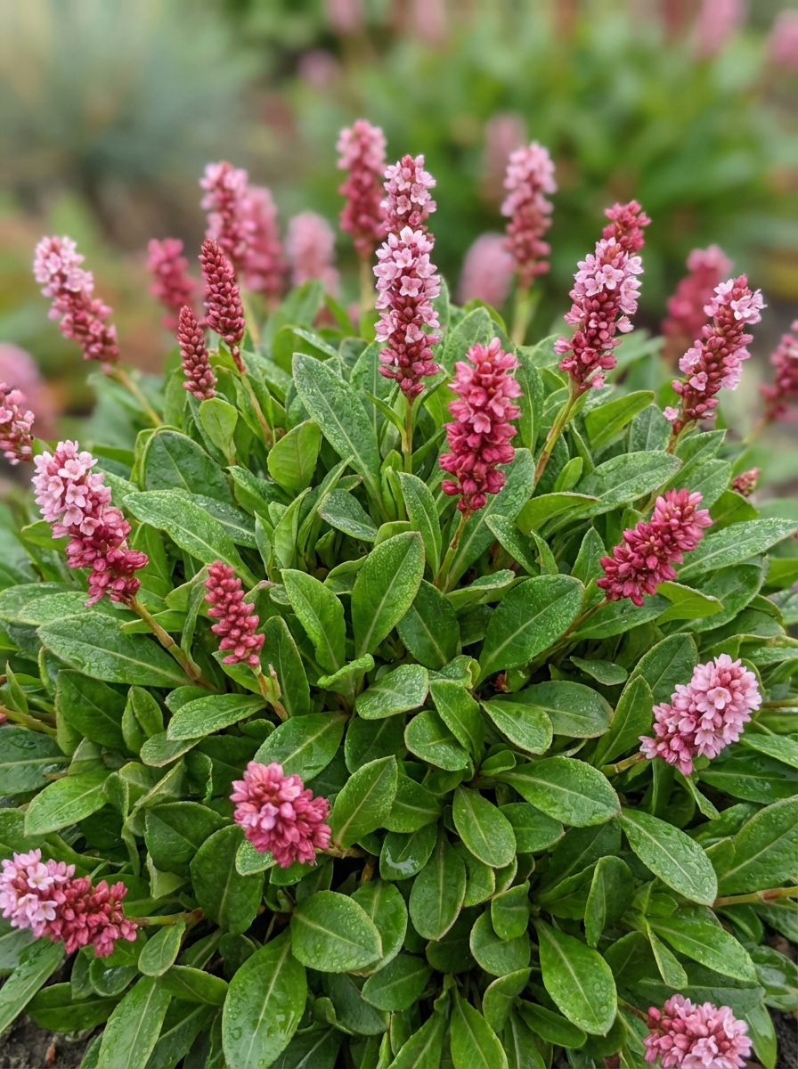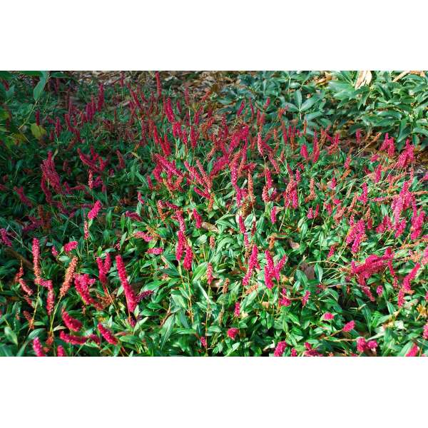 Persicaria affinis 'Darjeeling Red' forme un sol dense avec des rhizomes rampants et de grandes feuilles vert brillant qui s’effilent vers le pétiole.