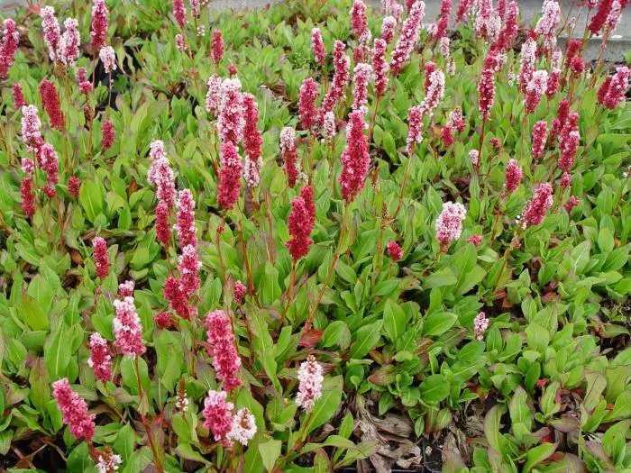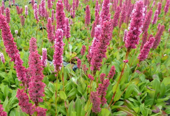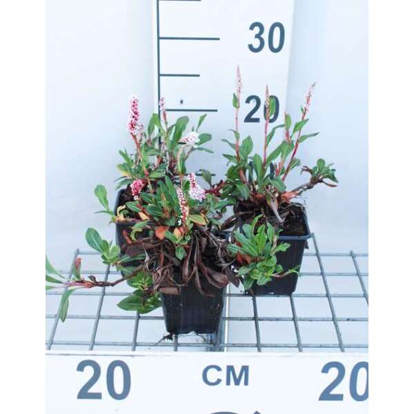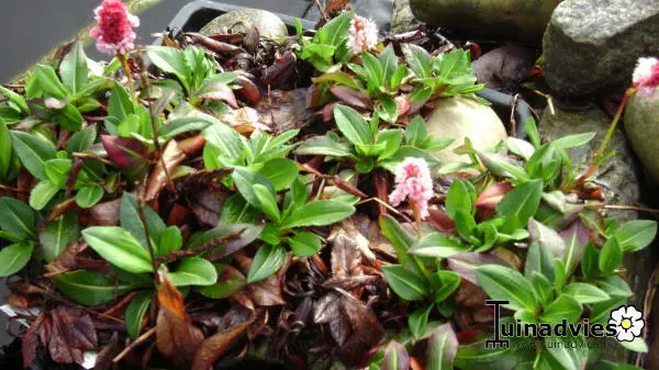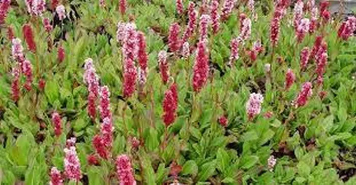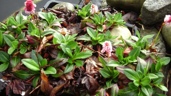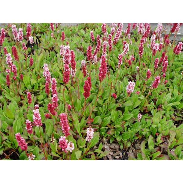 Persicaria affinis 'Gnome' forme un sol dense avec des rhizomes rampants et de grandes feuilles vertes brillantes qui s’effilent vers le pétiole avec de magnifiques couleurs brunes d’automne.
