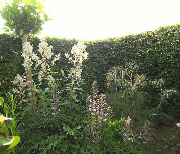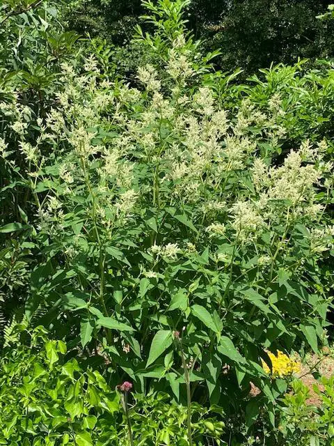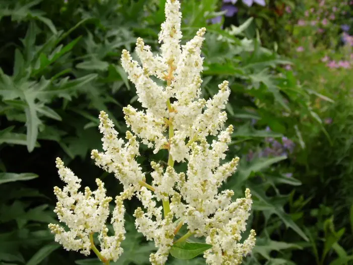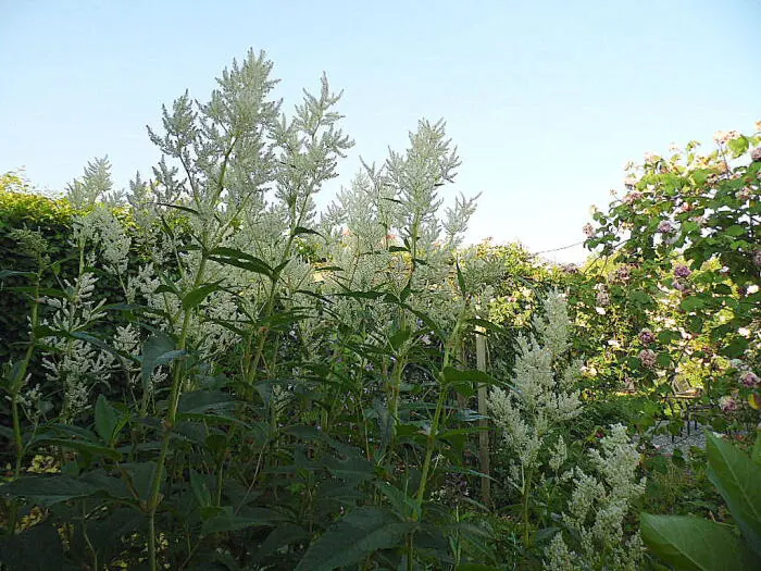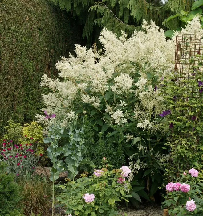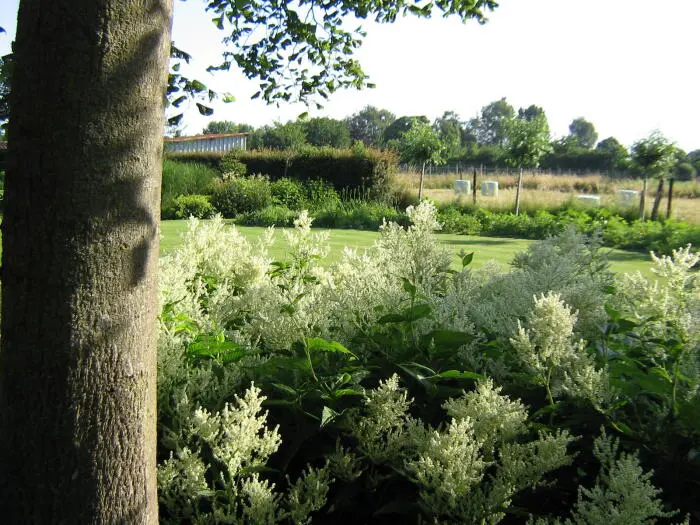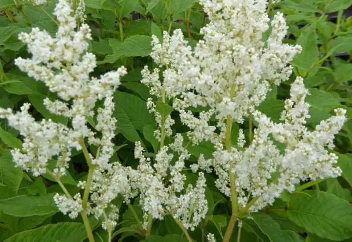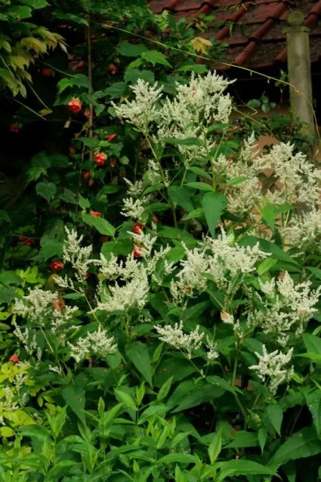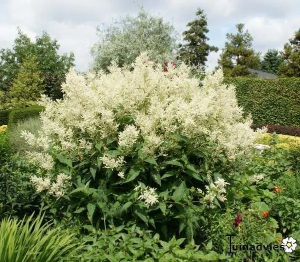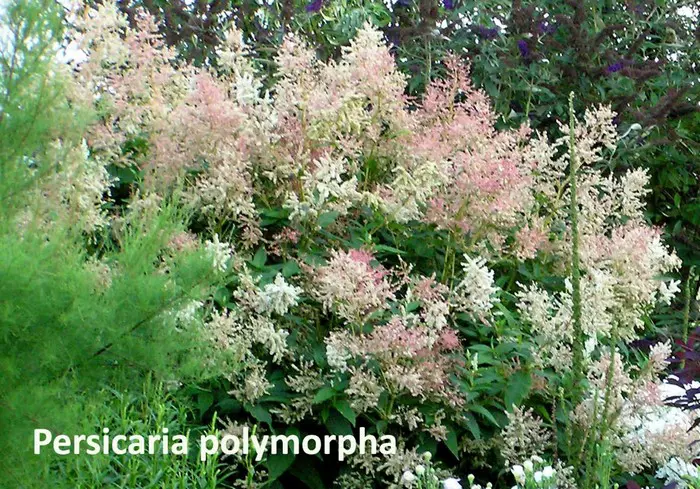Persicaria polymorpha forme un grand arbuste complet couvert d’innombrables épines ramifiées de fleurs blanches aromatiques.