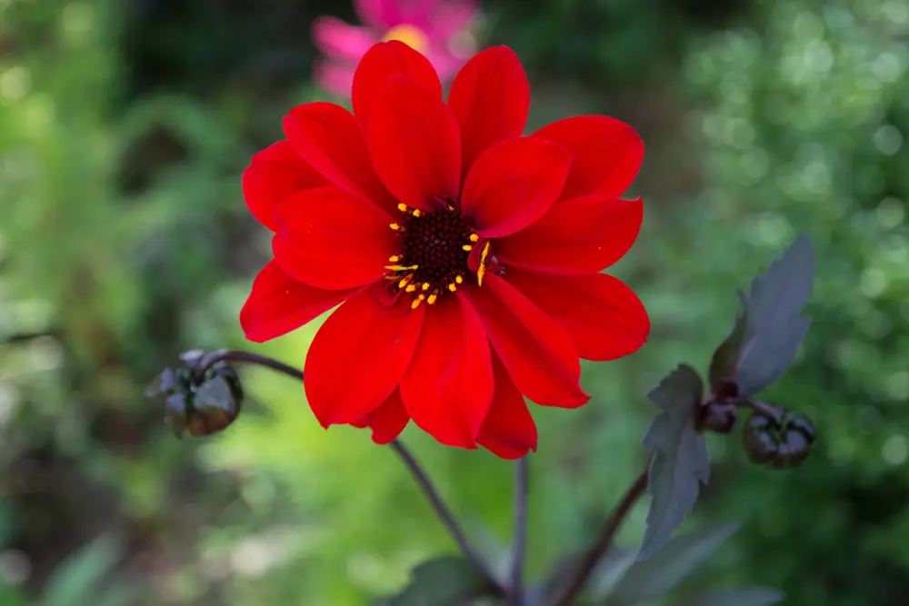 L’un des premiers dahlias récents à avoir contribué à l’amélioration de l’image est le dahlia « Bishop of Llandaff », une fleur écarlate semi-double, de sorte que les étamines jaunes sont clairement visibles. Le rouge plus vif de la fleur contraste magnifiquement avec les feuilles sombres, très décoratives même avant la floraison. Les feuilles sont très foncées, profondément incisées et un peu semblables à des fougères. La couleur épicée demande des combinaisons bien pensées. Combinez le rouge vif avec Artemisia et laissez-le revenir en Lobelia « Reine Victoria ». Ou donnez aux fleurs rouges un rôle d’accent dans un massif avec beaucoup de verdure ou avec des herbes ornementales.