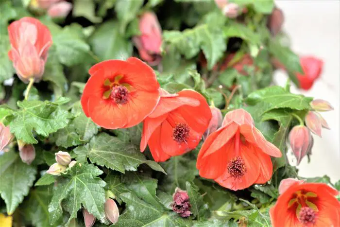 Abutilon 'Lucky Lantern Red' est un cultivar à longue floraison et à croissance compacte, avec de grandes fleurs suspendues en forme de cloche rouge.