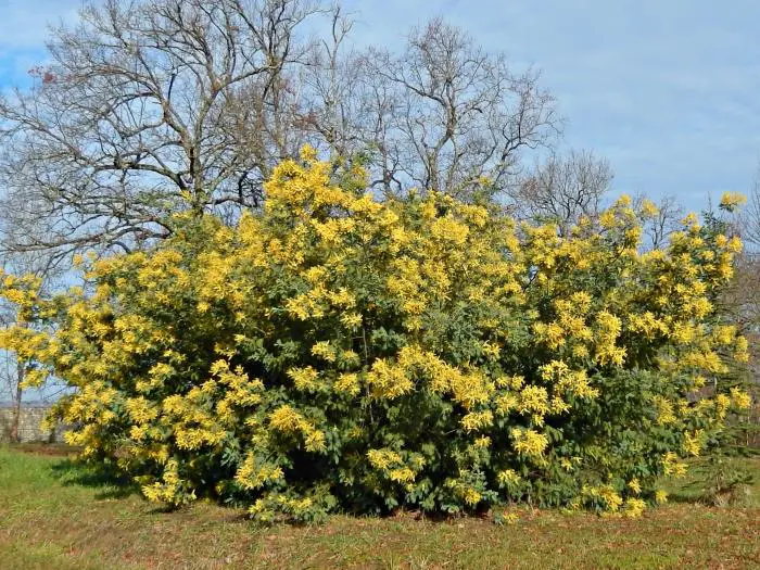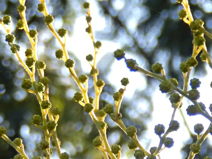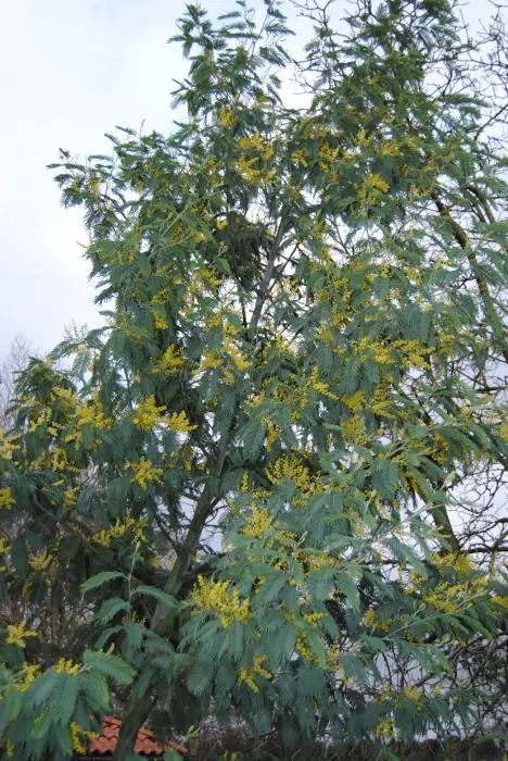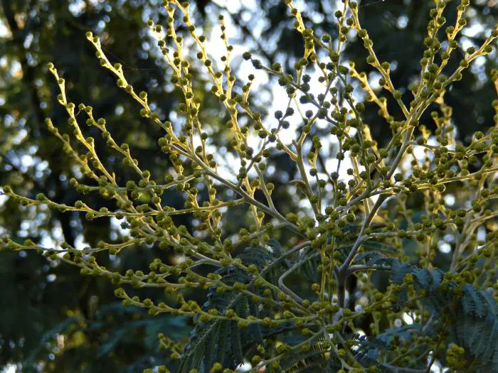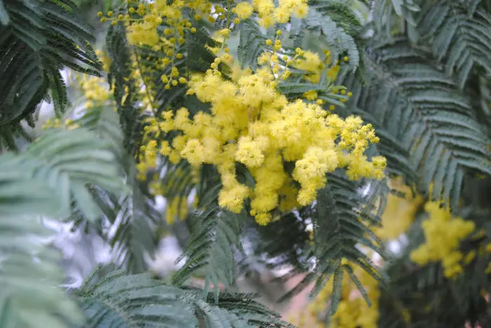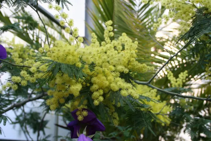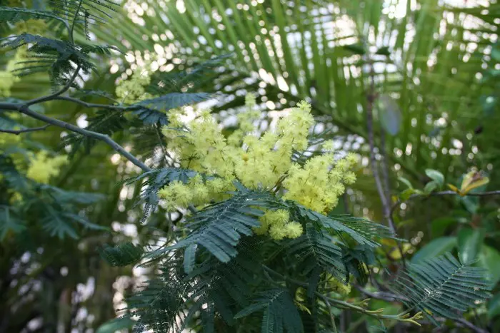 Elle fleurit avec des fleurs rondes et duveteuses et des feuilles pinnées argenté-vert/bleu-vert.