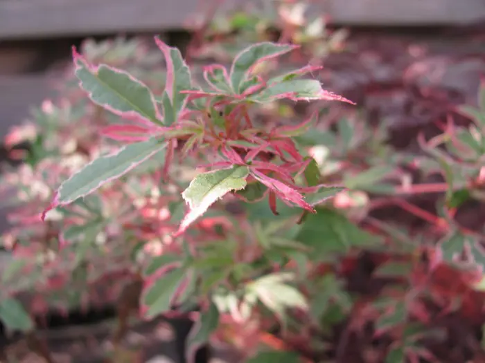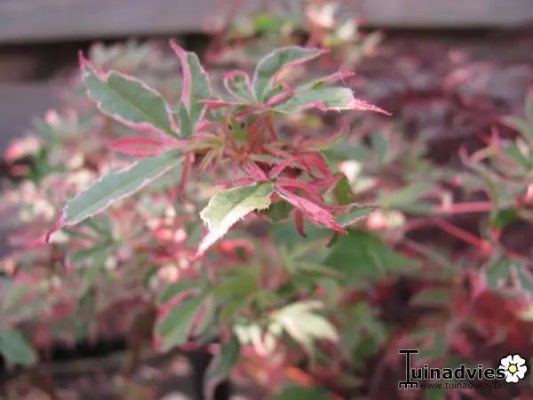 Le feuillage est particulièrement éclatant au printemps, vert clair bordé de rose et parfois de crème. Cette belle teinte s’adoucit un peu en été, après quoi le petit arbre devient d’un rose rouge intense à l’automne.