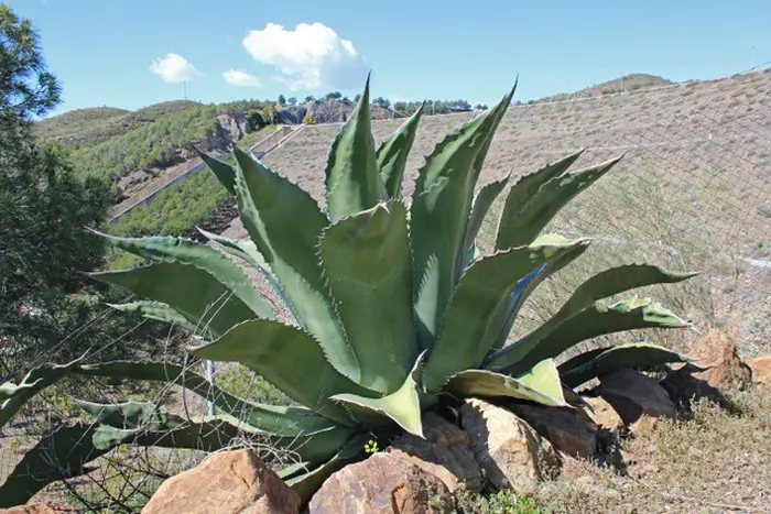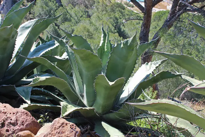 Agave salmiana var. Le ferox forme une rosette de longues feuilles larges, en surplomb et piquantes.