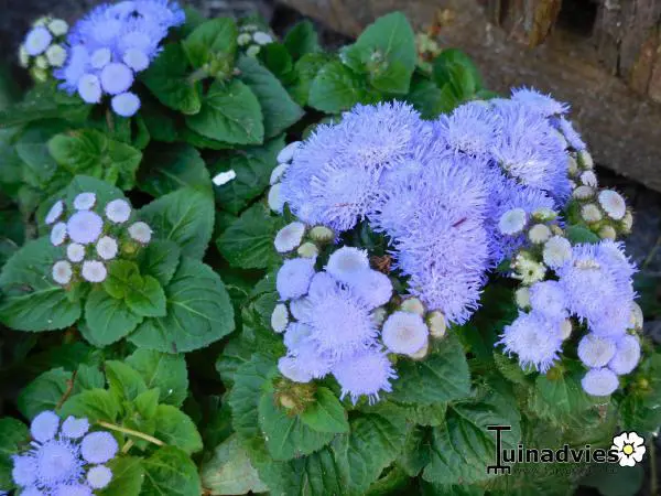 L’ageratum houstonianum 'Blue Mink' fleurit avec des fleurs joyeuses et duveteuses.