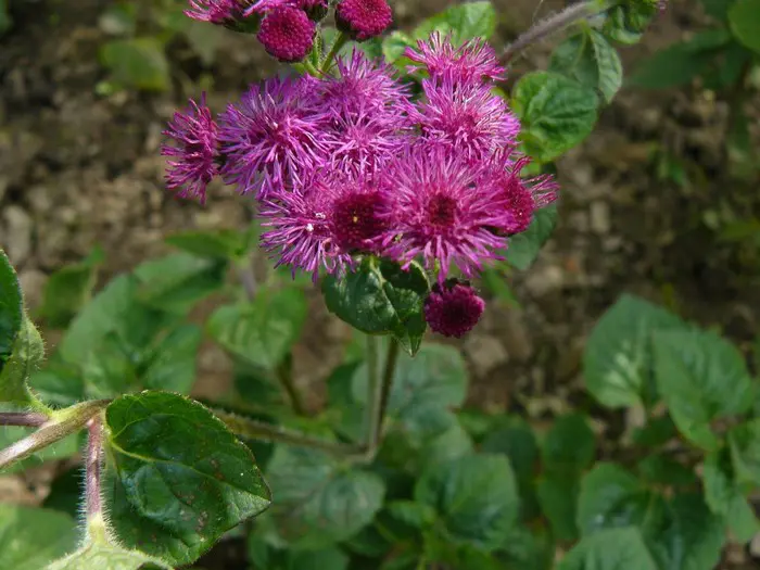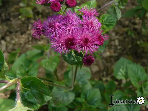 Ageratum houstonianum 'Red Sea' est d’abord rouge flamboyant et devient rouge violet.