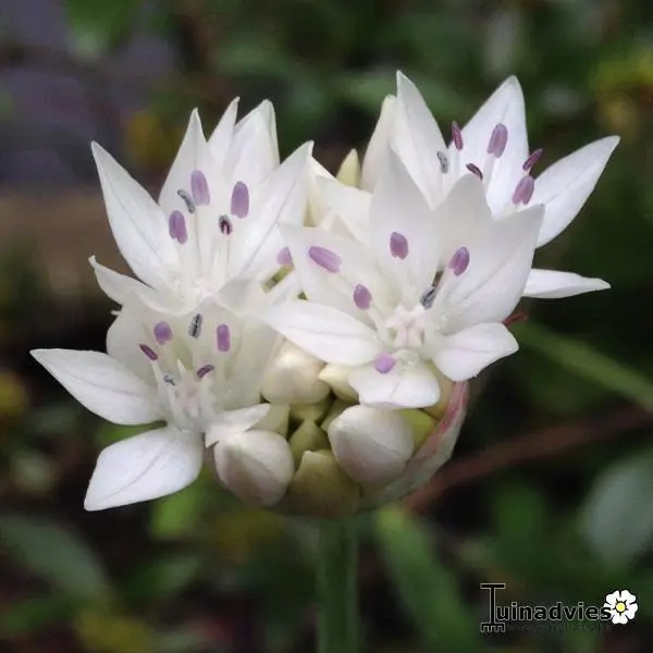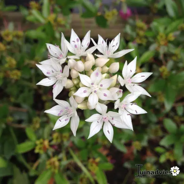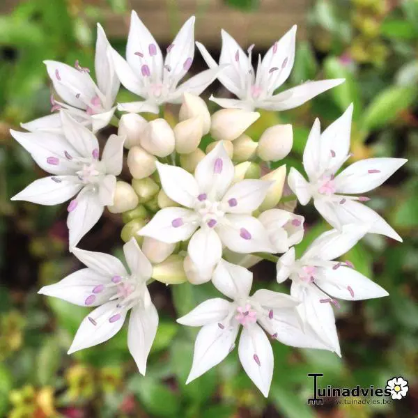 Elle forme une ombrelle sphérique de fleurs blanches en forme d’étoile avec des étamines lavande et des anthères violettes.