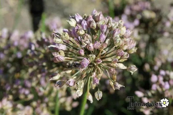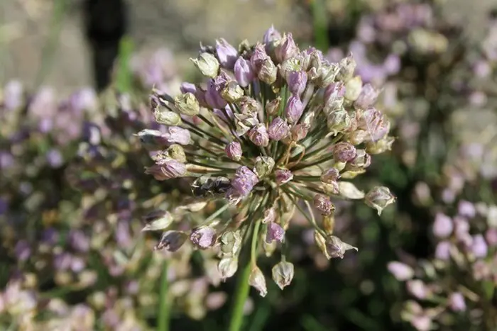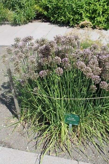 Allium angulosum fleurit avec des ombelles semi-circulaires lilas douces.