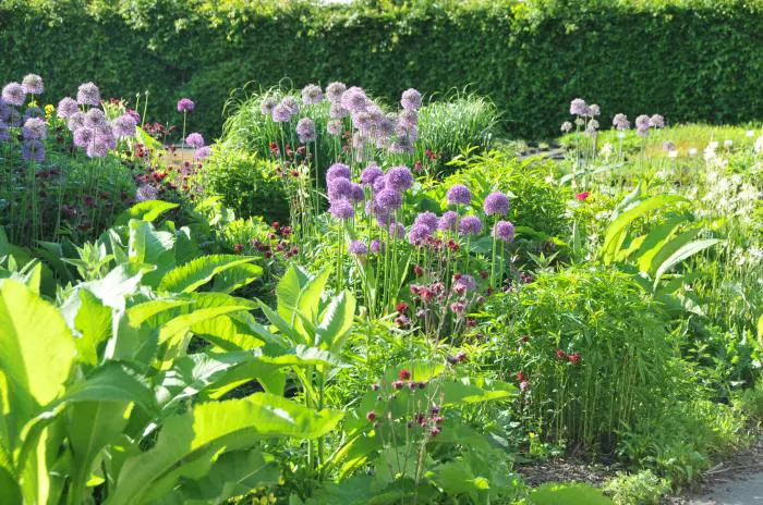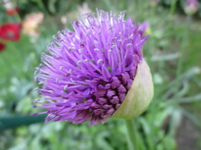 Allium 'Gladiator' fleurit sur des tiges élevées, dressées et robustes, avec de grandes fleurs sphériques lilas-violet composées de petites fleurs en forme d’étoile.