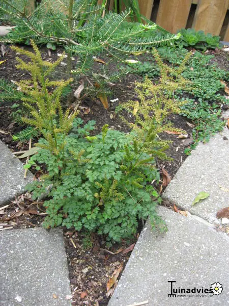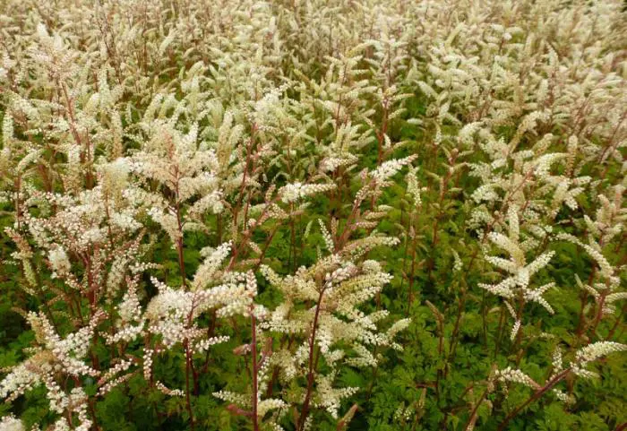Les feuilles semblables à des fougères sont vert foncé avec une couleur bronze en automne et fleurissent avec de plus petites panicules blanc crème.