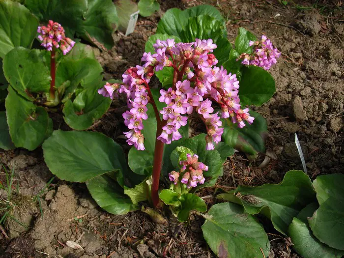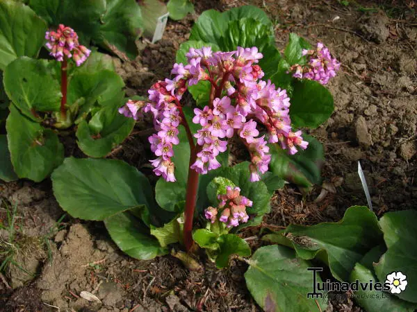 Bergenia 'Eden’s Dark Margin' est une stade à floraison précoce avec des fleurs rose-rouge et des feuilles bordeaux foncé/vert bronze.