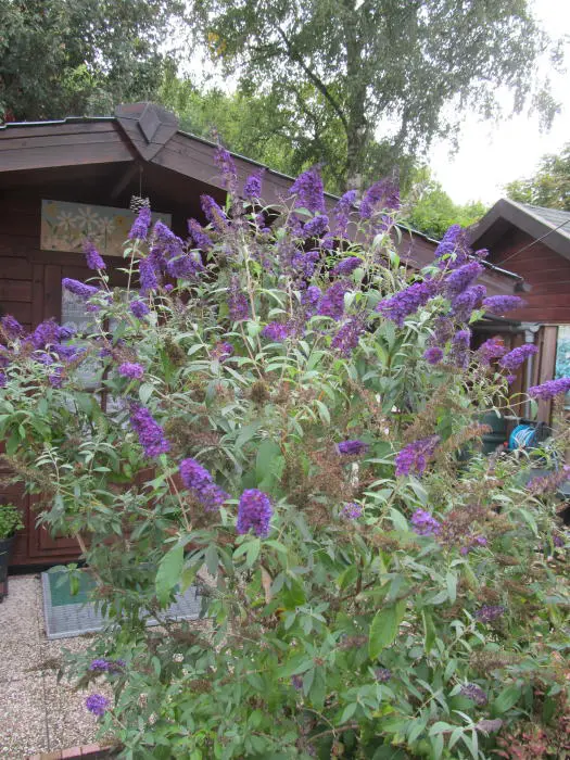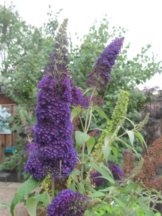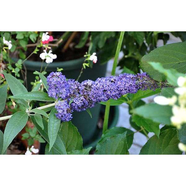 Buddleja davidii 'Adonis Blue' est un buisson de papillons larges à croissance plus basse avec des branches suspendues et de longues fleurs bleu-violet.
