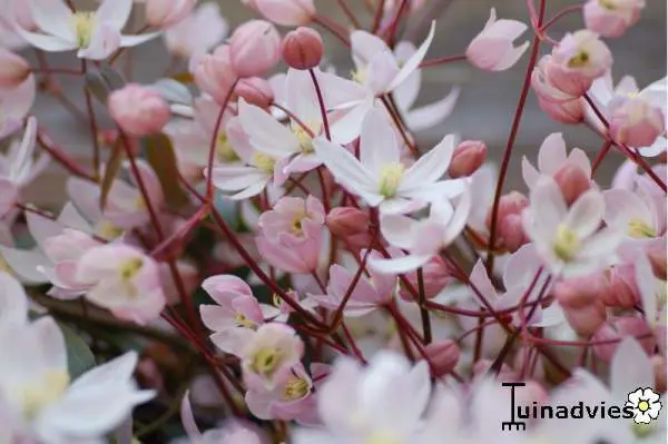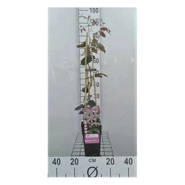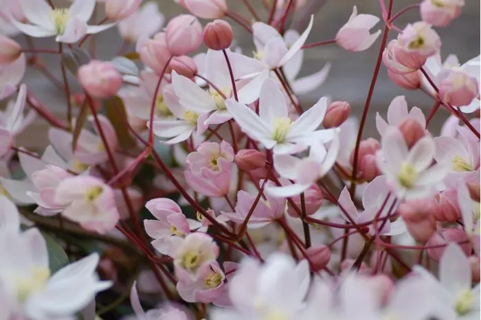Clematis armandii 'Fleur de pommier' fleurit d’un rose clair et sent l’amande, pouvant atteindre jusqu’à 450 cm de hauteur.
