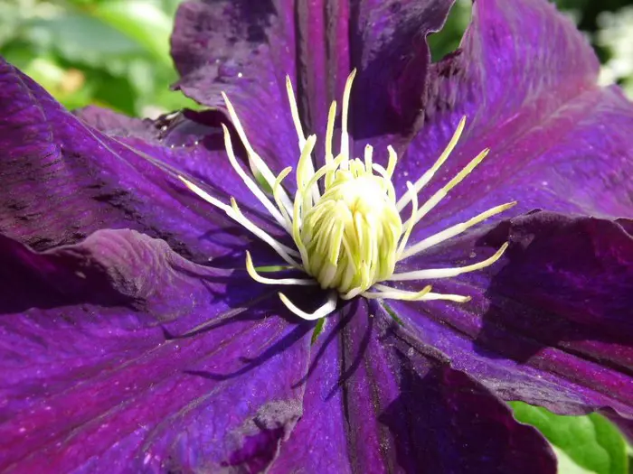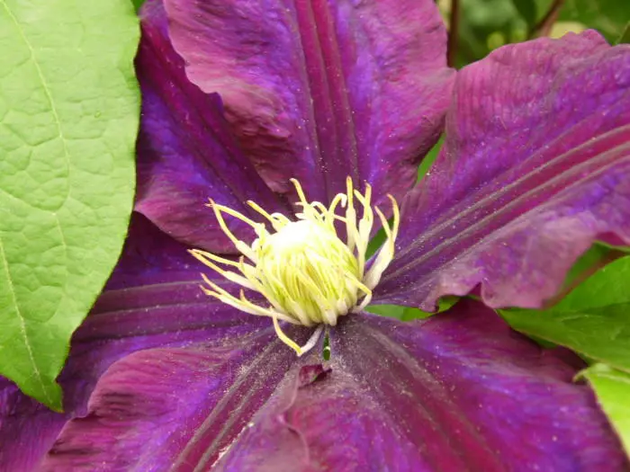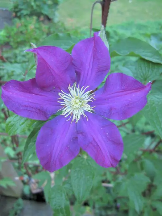 Une clématite dont la fleur de taille moyenne présente une couleur violette-violette très foncée et des étamines jaunes.