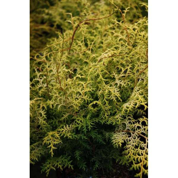 Chamaecyparis obtusa 'Lucas' est un magnifique conifère jaune qui fleurit en avril, suivi de petits cônes.