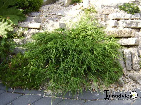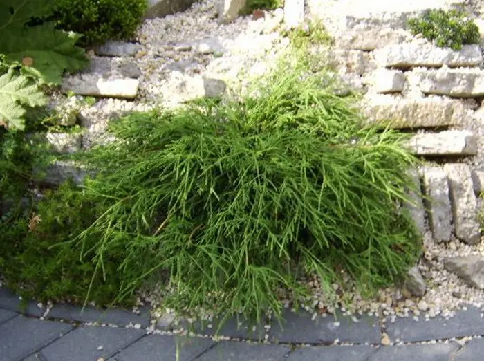 Chamaecyparis pisifera 'Filifera Nana' forme un arbuste rond avec de longues brindilles fines et pendantes.