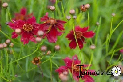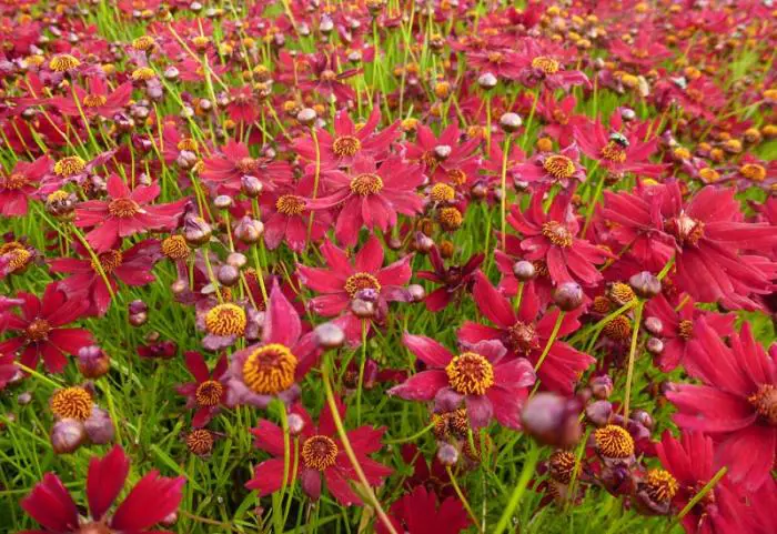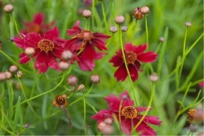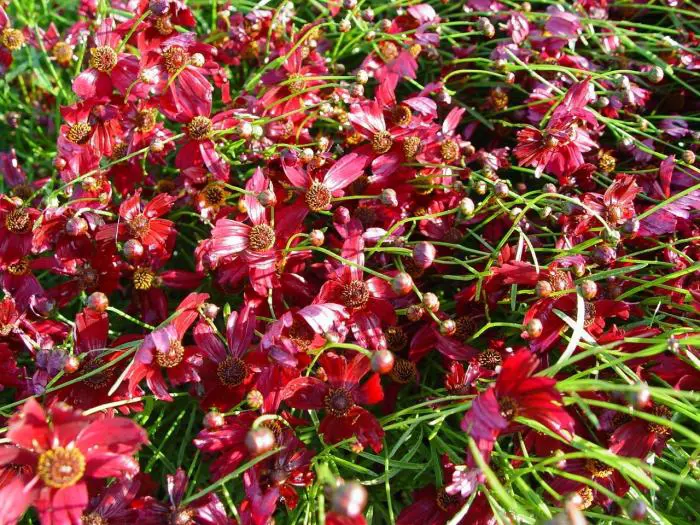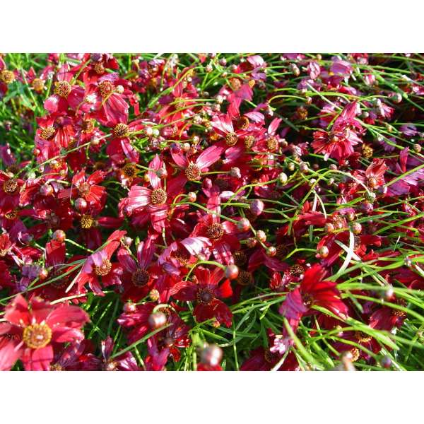 Coreopsis verticillata 'Ruby Red' est une vivace compacte formant des collines, avec des feuilles vert foncé finement divisées.