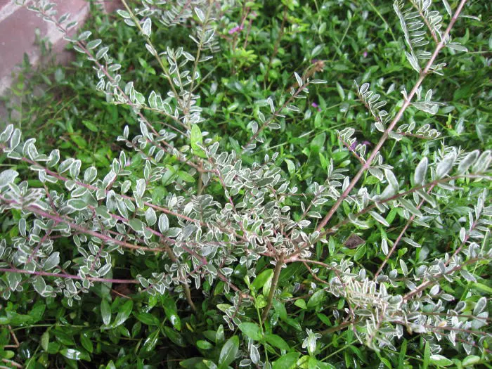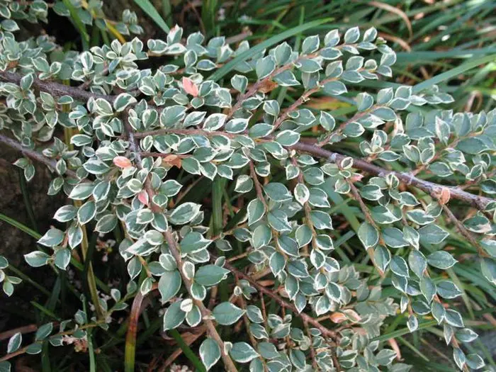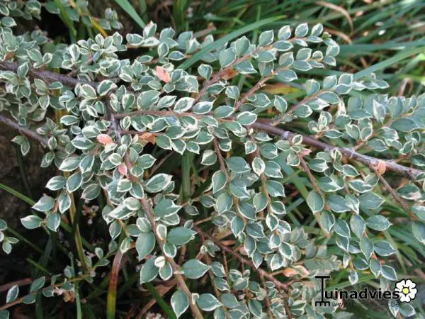 Cotoneaster atropurpureus 'Variegatus' est un arbuste à croissance plate avec de petites feuilles vertes bordées de blanc.