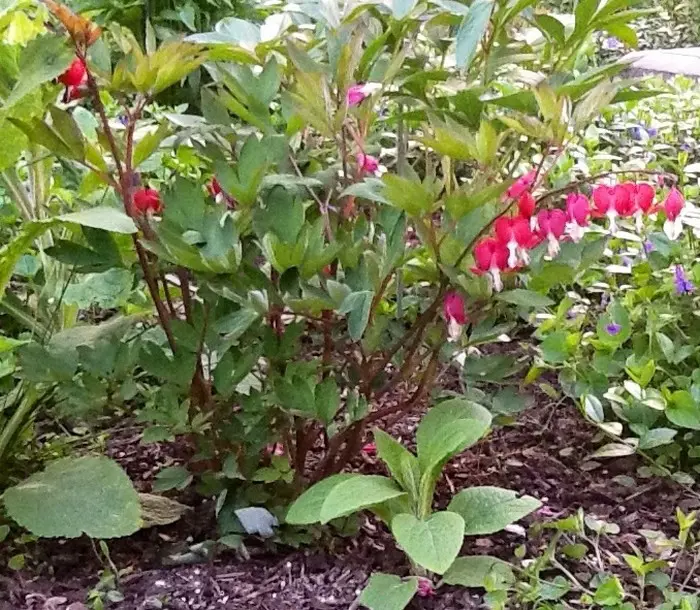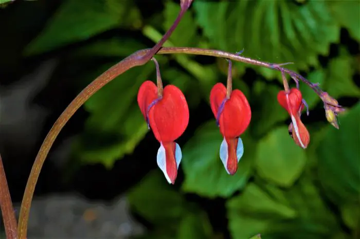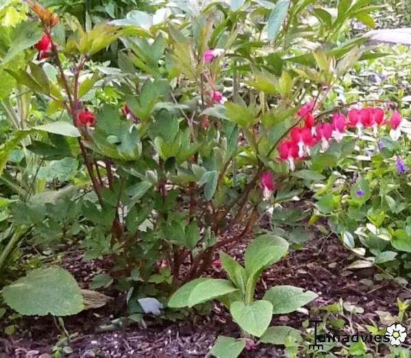 Possède une feuille composée gris-vert avec de gracieuses tiges violettes, des fleurs séparées rouge sang rappelant un cœur.