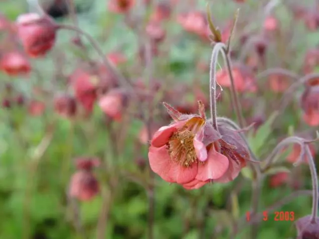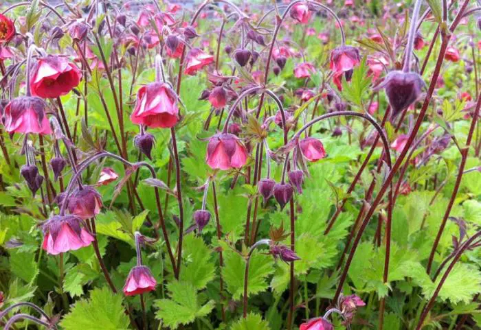 Geum rivale 'Leonard’s Variety' est une bonne plante bordure avec des fleurs orangées rose cuivre inclinées sur tiges foncées.