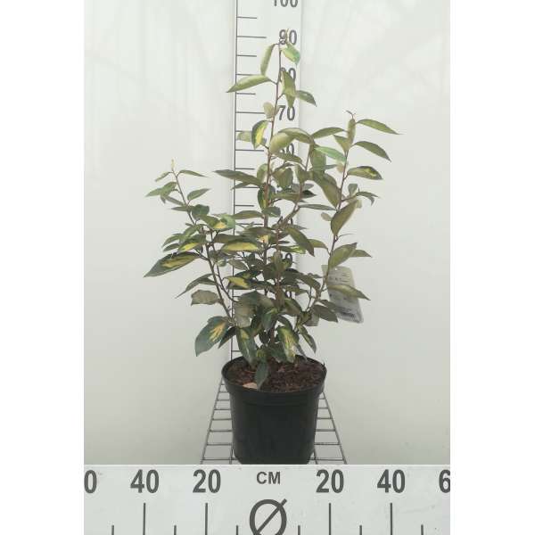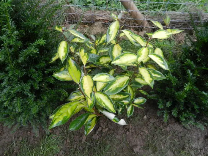 La forme de feuille de l’Elaeagnus x ebbingei « Limelight » rappelle celle de l’olivier, grandes et brillantes, cuireux, feuilles ovales, jaunes panachées avec un dessous gris.