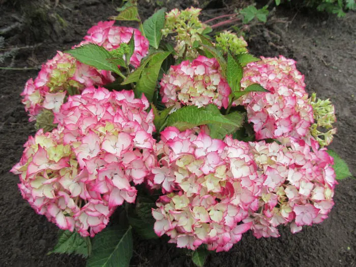 Hydrangea macrophylla CHARMING 'Sophia' fleurit avec des fleurs sphériques. Les pétales blancs dentelés ont un bord rose.