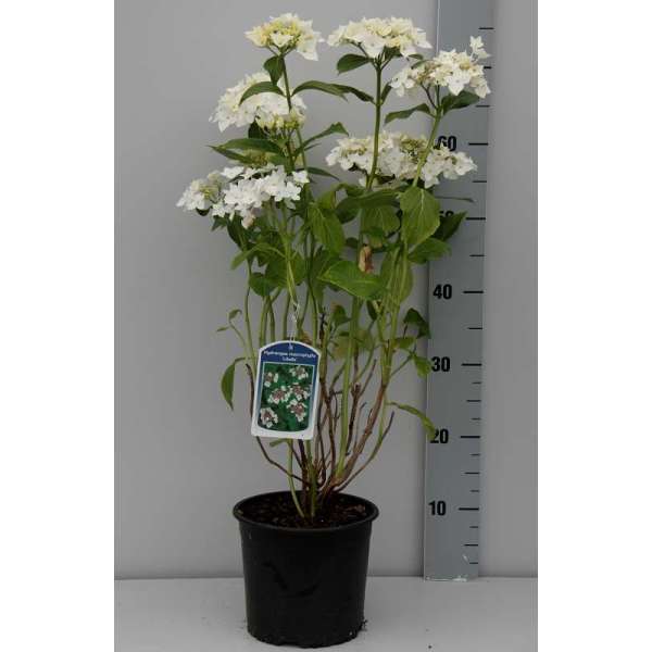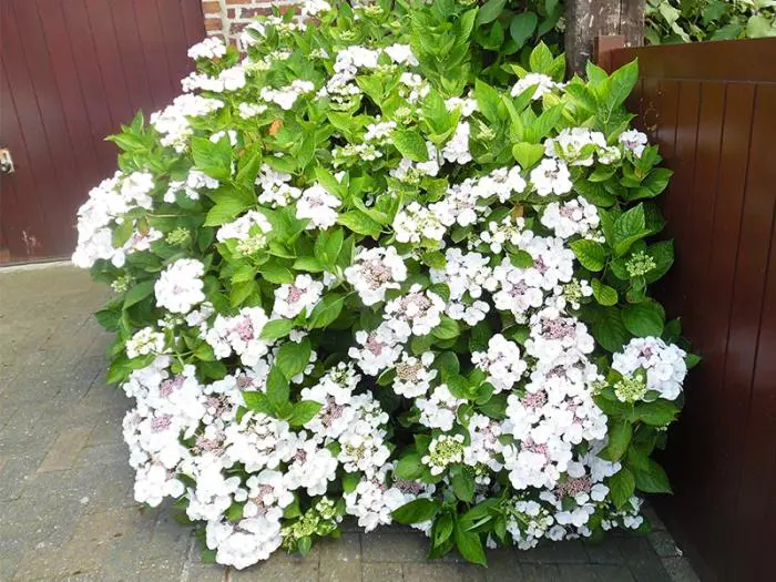 L’hortensia macrophylla 'Libelle' est un hortensia à croissance lente avec des ombelles plates. Les fleurs à bord blanc neigeux sont disposées autour de fleurs fertiles violette-rouge.