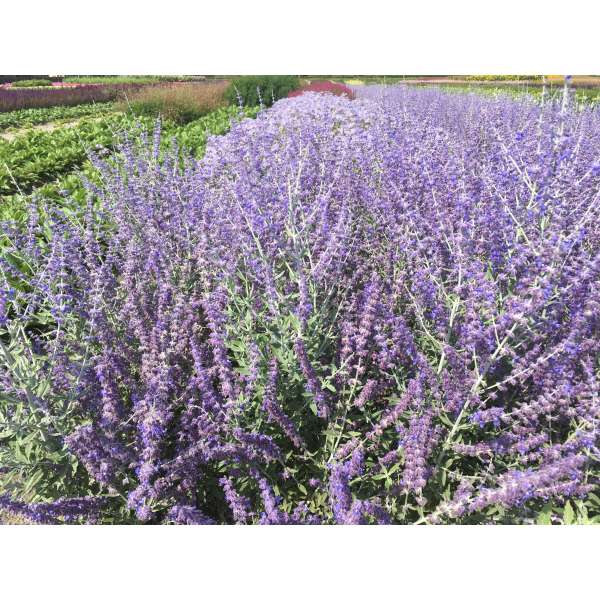 Perovskia atriplicifolia 'Lacey Blue' reste plus basse que l’espèce, fleurit avec des épis bleus.