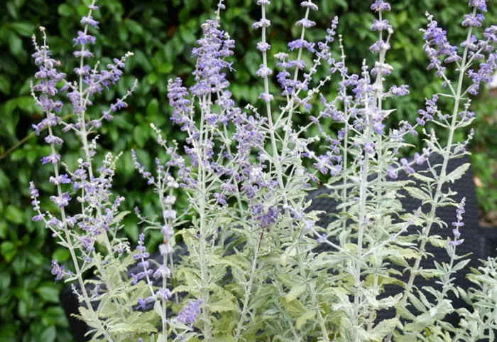 Perovskia atriplicifolia 'Argentée Bleue' est un cultivar aux feuilles argentées, qui reste plus bas que l’espèce +/-50 cm.