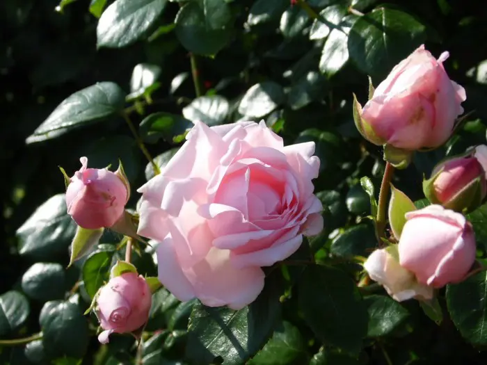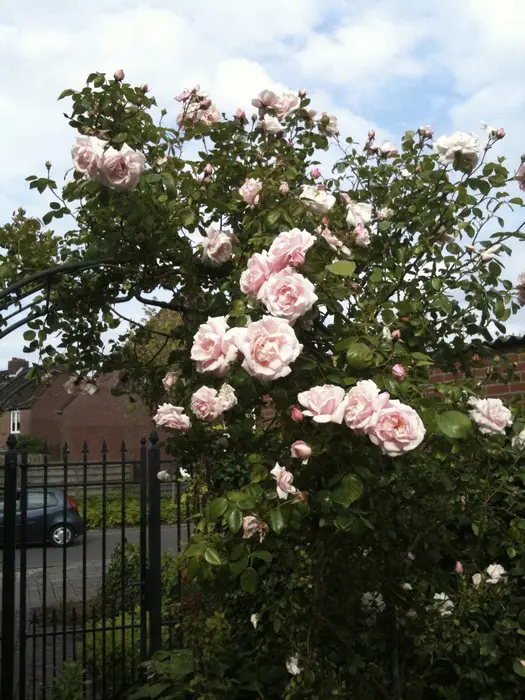 Une rose grimpatrice moderne qui remonte à la surface qui fleurit bien jusqu’à l’hiver avec des fleurs en forme de coupe rose nacrées et un feuillage sombre.