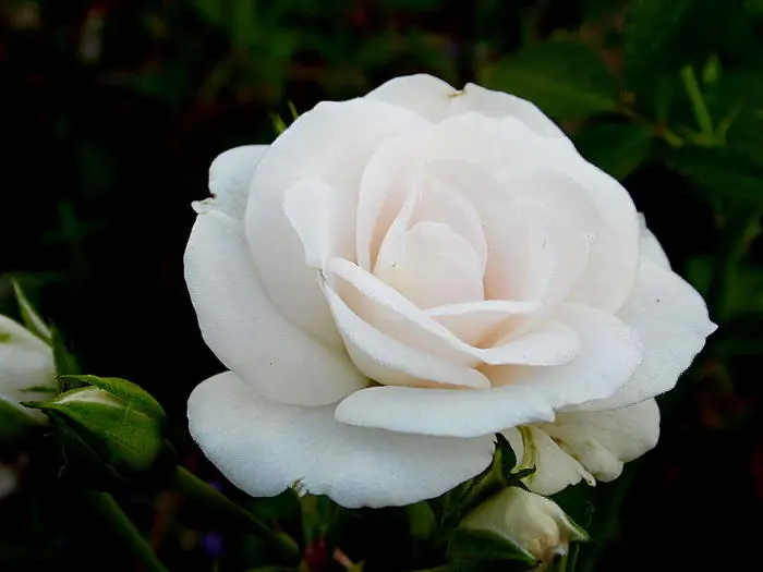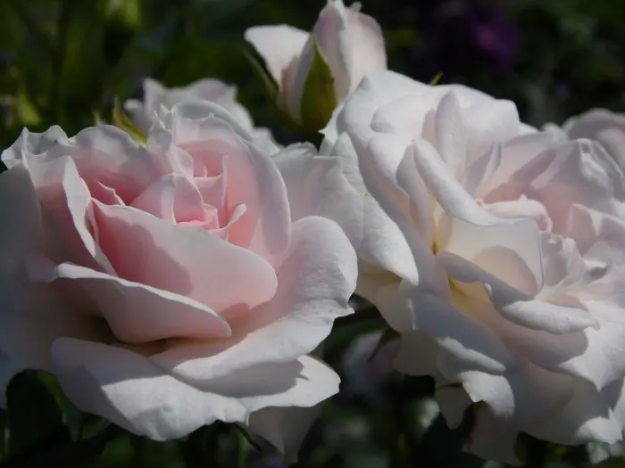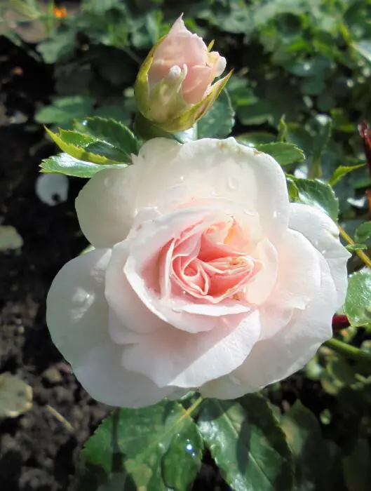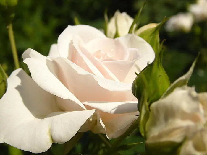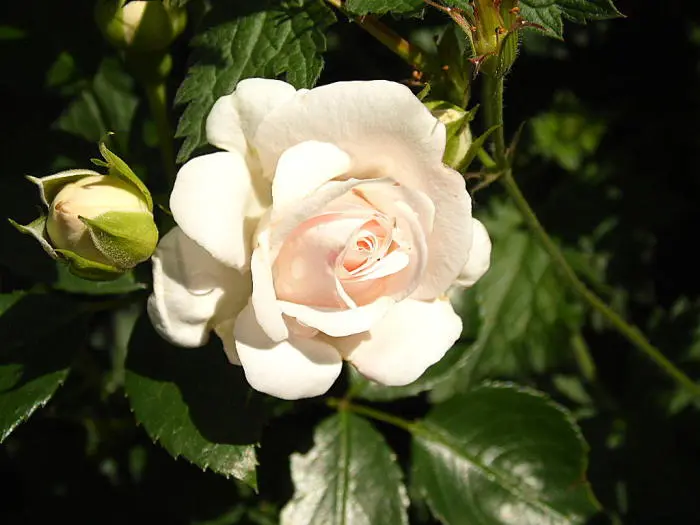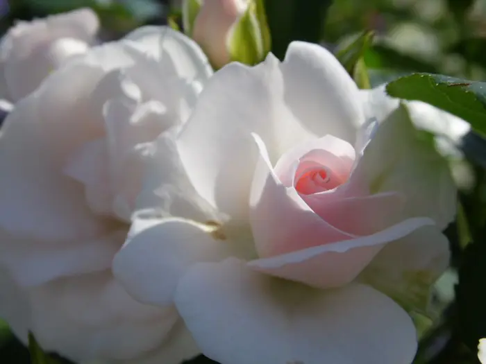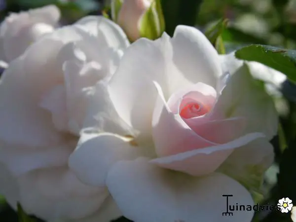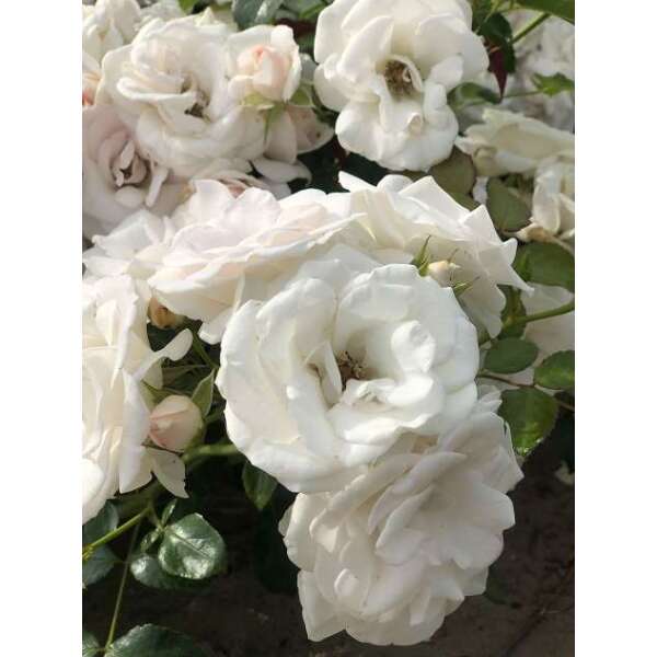 Une rose floribunda avec de petites fleurs blanches doubles, par temps froid les fleurs deviennent complètement roses. Les fleurs sont complètement ouvertes de 3 à 4 cm de taille.