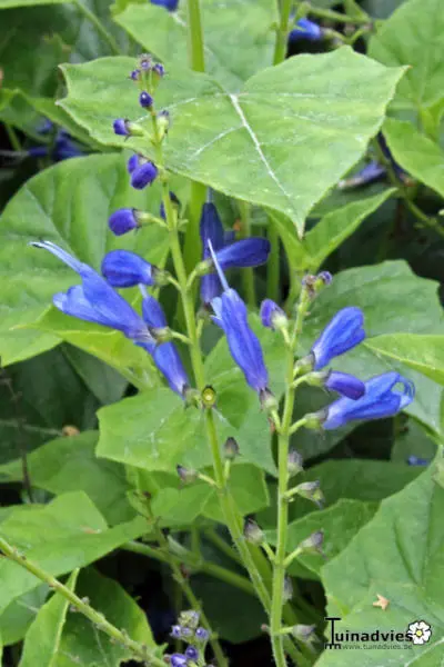 Un semi-arbuste originaire du Mexique avec de magnifiques feuilles triangulaires et des fleurs bleu pur.