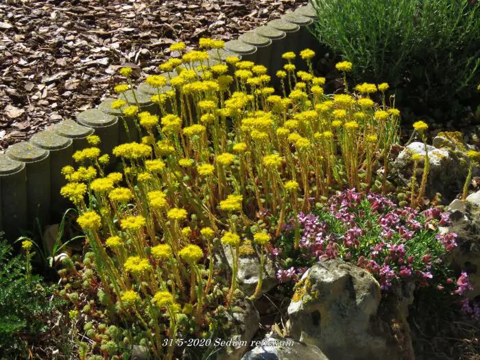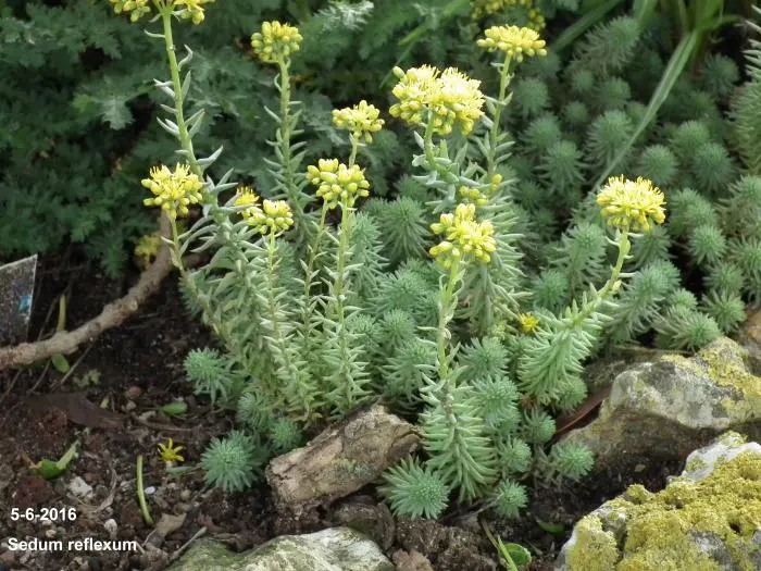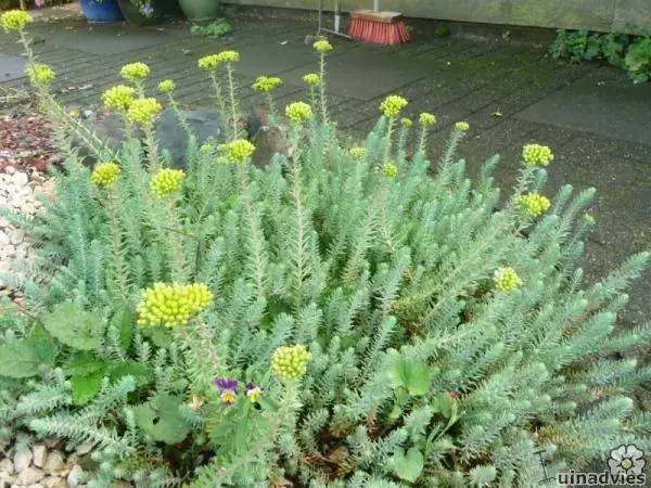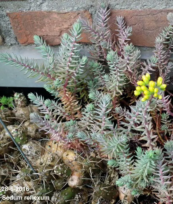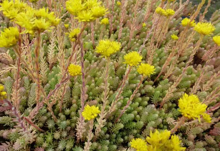 Fleurs jaune doré et feuilles charnues gris/bleu-vert parfois teintées de rouge.