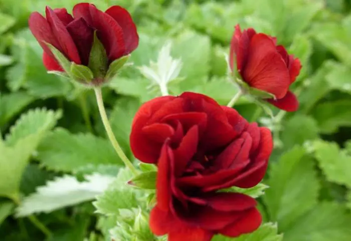 Potentilla 'Flamboyant' possède des feuilles fraîchement vertes, profondément nervées, et des fleurs doubles rouge foncé.