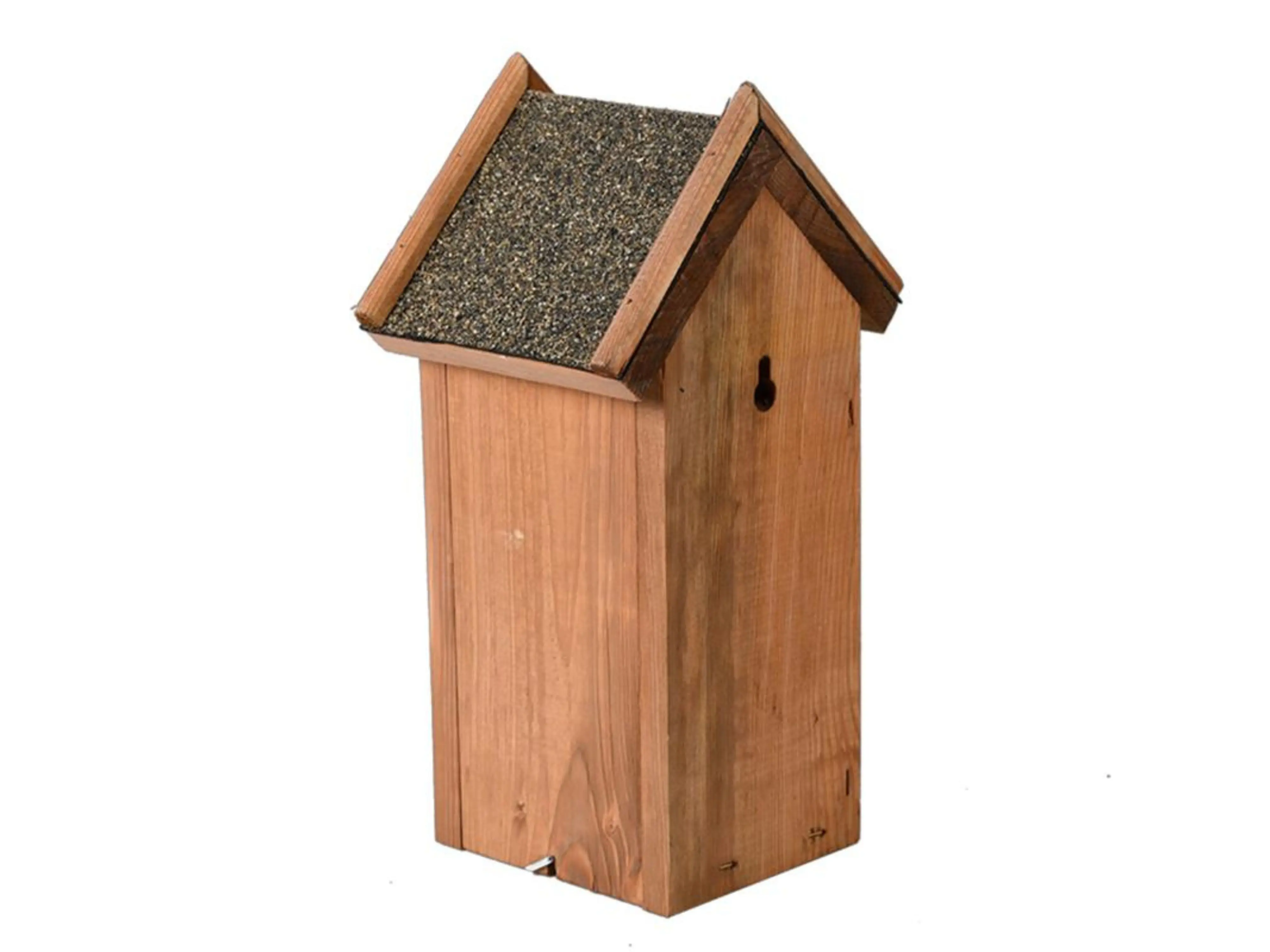 Le toit robuste en bitume protège le nid de la pluie, tandis que le côté avec la porte facilite le nettoyage de la boîte à l’automne. Cela maintient la boîte à nids en parfait état et permet aux oiseaux de s’y abriter du froid et du mauvais temps, même en hiver.