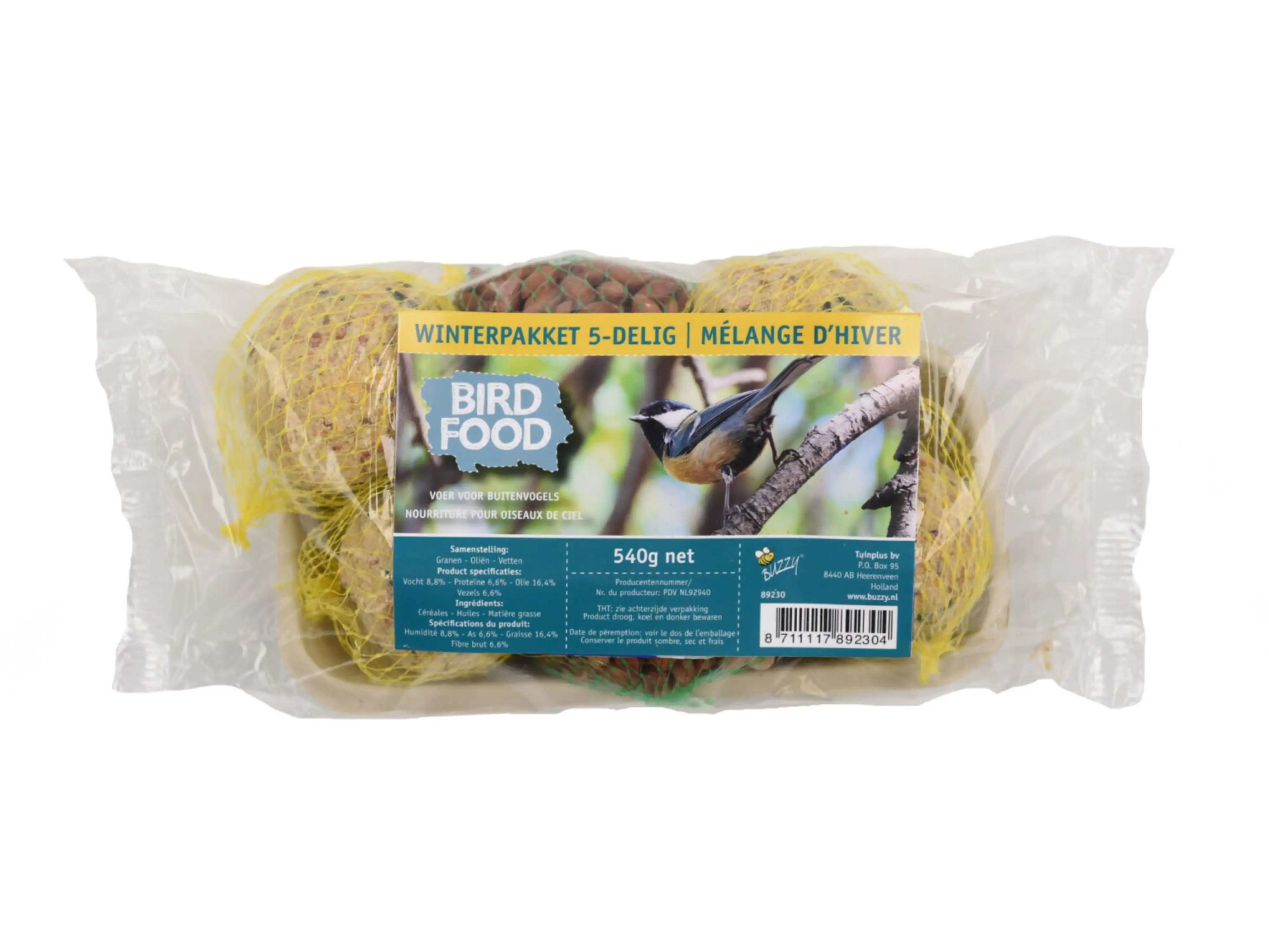 Pack d’alimentation hivernale en cinq pièces pour les oiseaux du jardin. Ce paquet d’hiver contient de la nourriture pour oiseaux stimulante et comprend quatre balles (90 grammes chacune) et un filet à cacahuètes (180 grammes).