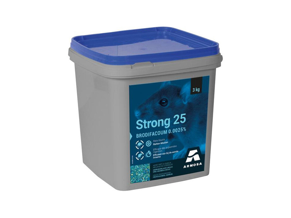 Le Strong 25 est l’appât le plus puissant du marché transformé en appât à céréales attractif. Une seule ingestion du poison brodifacoum suffit à tuer l’animal. Peut être utilisé dans le jardin, dans le grenier, au sous-sol, dans l’abri de jardin,...