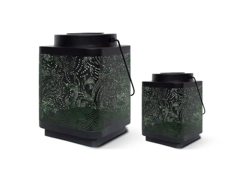 Le boîtier métallique robuste à finition noire offre non seulement un aspect élégant et intemporel, mais aussi une durabilité et une résistance aux intempéries pour un usage extérieur. Grâce à la poignée pratique, la lampe peut facilement être suspendue ou déplacée, ce qui vous permet de décider où créer l’atmosphère.