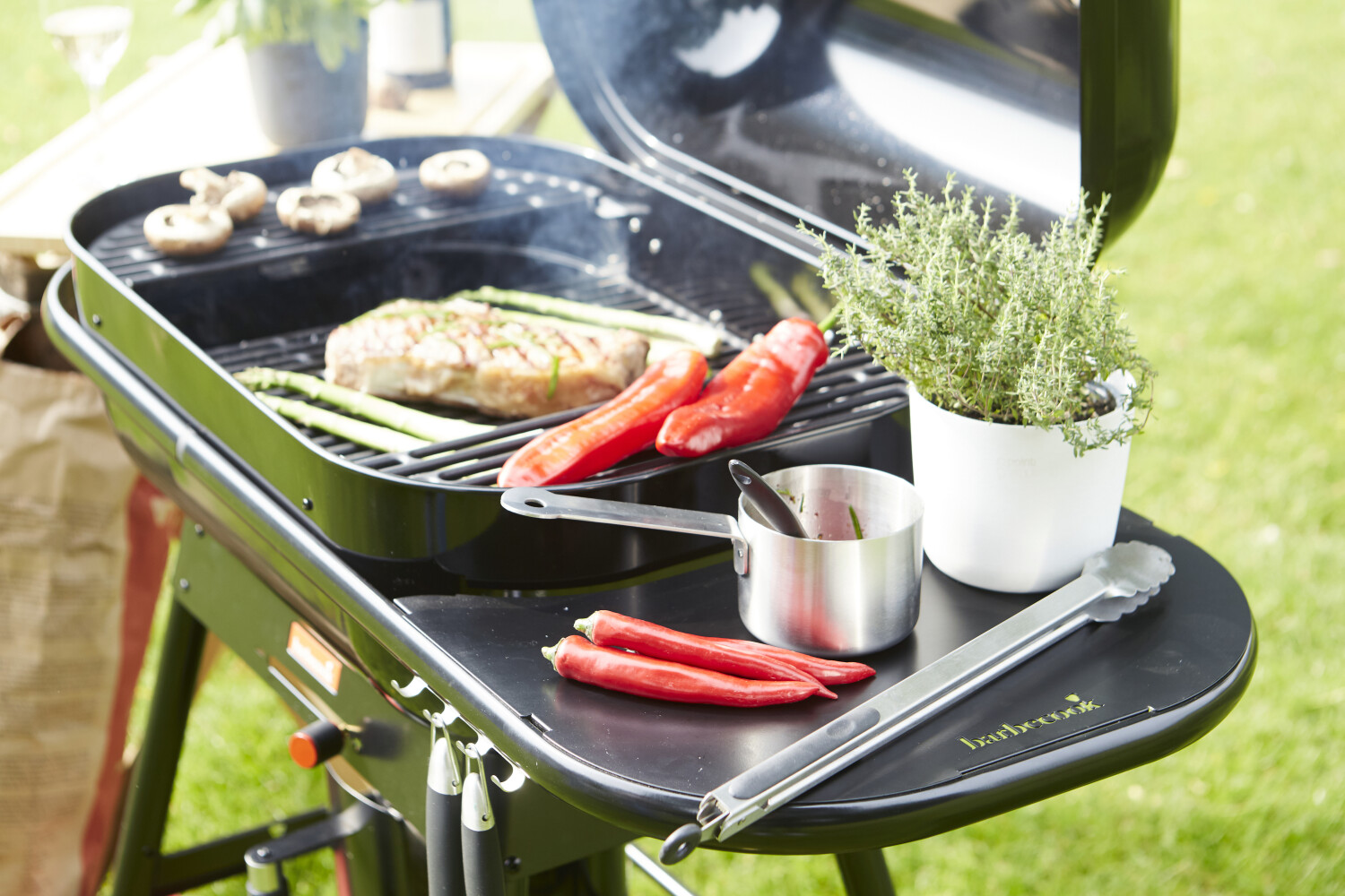 La base extra-large assure une stabilité maximale et les roues robustes facilitent le déplacement du barbecue. Le barbecue a une hauteur de cuisson ergonomique parfaite pour une facilité d'utilisation ultime. Sur l'étagère latérale, vous pouvez préparer tous vos ingrédients et accrocher vos outils de barbecue sur les crochets en acier inoxydable.