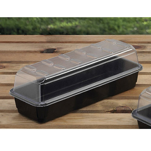 Serre étroite ou bac à semences, taille idéale pour votre rebord de fenêtre. Ce propagateur à coque noire est équipé des trous de drainage nécessaires et peut être recouvert d’un couvercle transparent.
