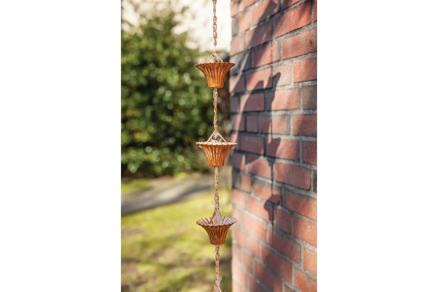L’eau peut être recueillie au fond de la chaîne dans un tonneau de pluie ou un élément aquatique. Si désiré, vous pouvez suspendre plusieurs colliers les uns sous les autres.