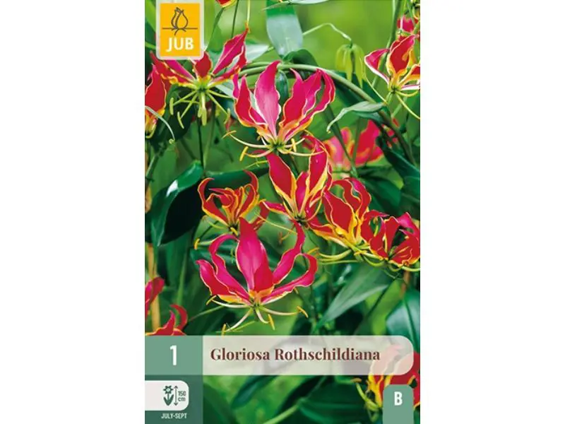 Gloriosa 'Rothschildiana' est une plante grimpante spectaculaire aux fleurs rouge flamboyante et aux bords jaunes. Les longues étamines jaunes confèrent à la fleur une apparence exotique et frappante. La plante pousse à partir d’un tubercule et peut être plantée en pot sur le balcon ainsi que dans le sol, de préférence vers la mi-avril.