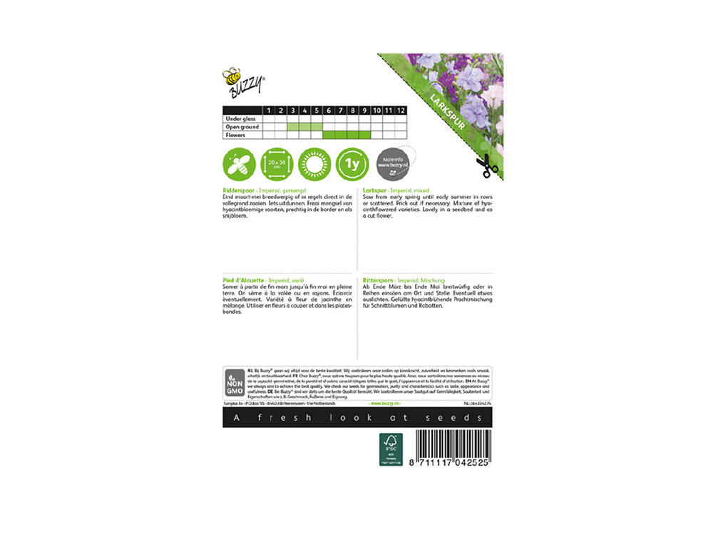 Larkspur Imperial dans un magnifique mélange de couleurs. Les plantes fleurissent dans des tons bleu, lilas-rose et blanc. Magnifique à utiliser sur la bordure et magnifique dans le vase. En plus d’être une excellente fleur séchée, la plante est également visitée par les papillons et les abeilles