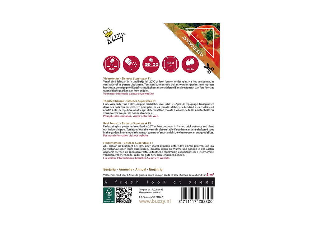 Semez à partir de fin février dans un bac à semences à 20°C ou plus tard à l’extérieur sous verre. Après la transplantation, plantez dans une serre ou en pots. Les tomates peuvent aussi être plantées en extérieur si elles sont dans un endroit abrité et ensoleillé ! Enlève régulièrement les pousses latérales !