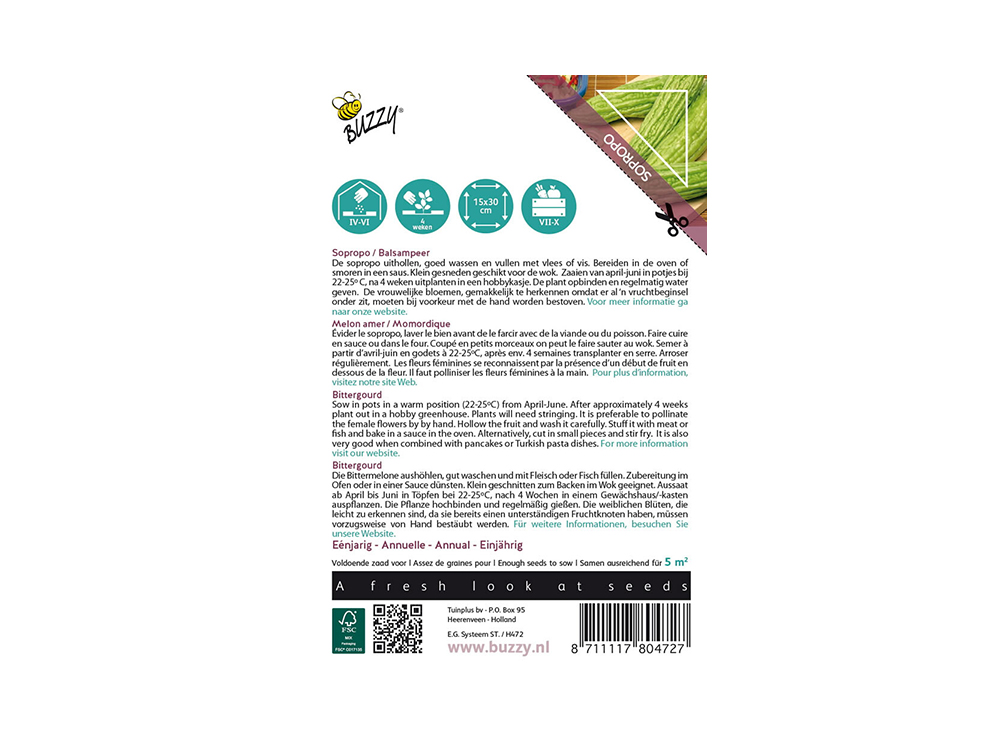 Semez d’avril à juin en pots à 22-25ºC, après 4 semaines de plantation dans une serre de loisir. Attachez la plante et arrosez-la régulièrement. Les fleurs femelles, faciles à reconnaître car elles ont déjà un ovaire en dessous, devraient de préférence être pollinisées à la main.