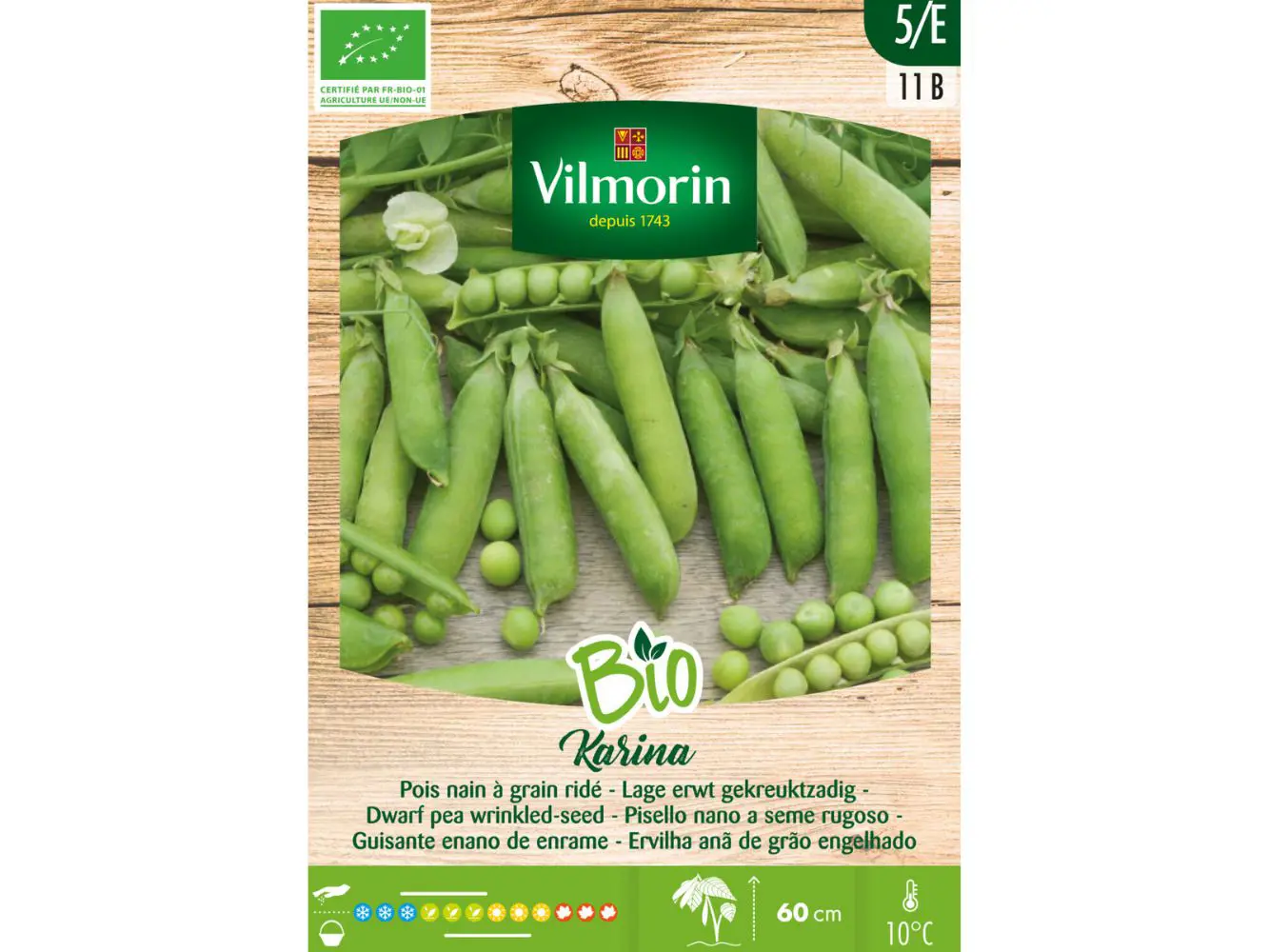 Faites pousser vos propres pois biologiques avec les graines de Vilmorin. La satite froissée de Karina est une variété à croissance basse et verticale avec des gousses vert foncé et droites. Chaque gousse contient environ 8 à 9 graines.