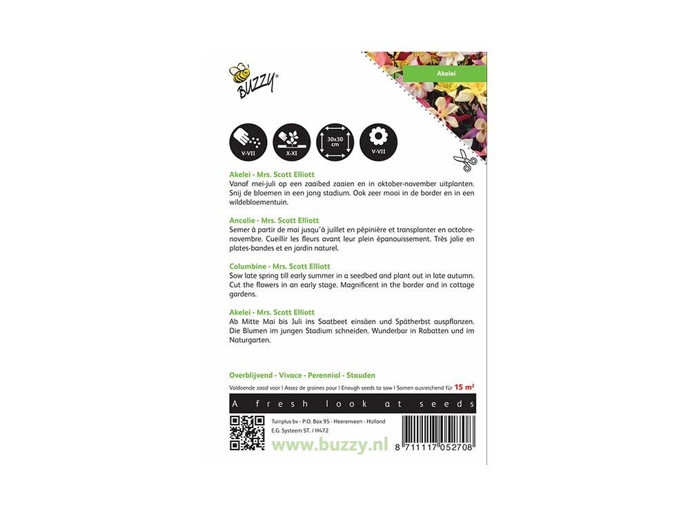 Ce paquet contient des graines de magnifiques columbines qui fleurissent de toutes sortes de couleurs. Les fleurs de Columbine Mrs. Scott Elliott sont grandes et frappantes et présentent généralement différentes nuances dans une même fleur. Ce sont de magnifiques plantes pour des endroits abrités, un peu ombragés, sur un sol légèrement humide. Aussi adapté à la naturalisation.